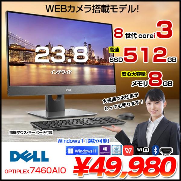 【中古パソコン】DELL OptiPlex 7460 AIO 中古 一体型デスク Office Win10 or Win11 キー・マウス[Core i3 8100 メモリ8GB SSD512GB カメラ 無線 23.8]:良品