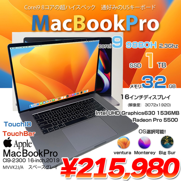 【中古パソコン】Apple MacBook Pro 16inch MVVK2J/A A2141 2019 USキー 選べるOS TouchBar TouchID [core i9 9880H 32G 1TB 無線 カメラ 16インチ Space Gray] :良品