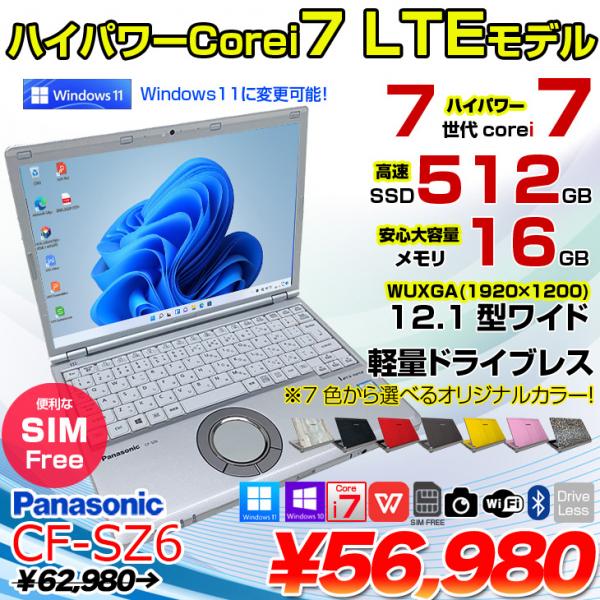 【中古パソコン】Panasonic CF-SZ6 中古 レッツノート 選べるカラー Office Win10 or Win11 第7世代[Core i7 7600U メモリ16GB SSD512GB WWAN WLAN カメラ 12.1型 ] :良品