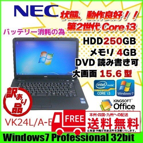 【中古パソコン】NEC VK24L/A-E 中古 ノートパソコン Office Win7 第2世代 大画面 [corei3 2370M 2.4GHz 4G HDD250GB マルチ 15.6型 A4 無線] :訳あり