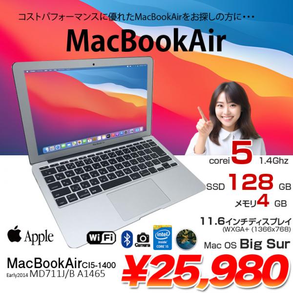 【中古パソコン】Apple MacBook Air 11.6inch MD711J/B A1465 Early 2014 [core i5 4260U 4G SSD128GB 無線 BT カメラ 11.6 BigSur 11] :アウトレット