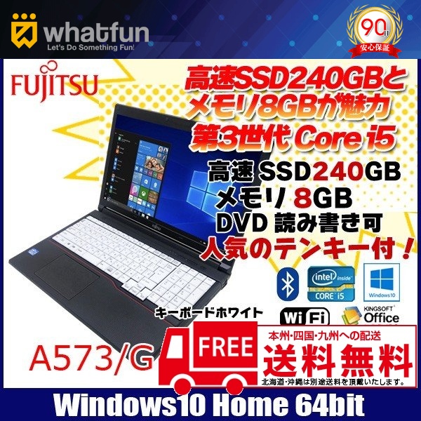 【中古パソコン】富士通 A573/G 中古 ノートパソコン Office Win10 高速SSD塔載 第3世代 テンキー [corei5 3340M 2.7GHz 8G SSD240GB マルチ 無線 15.6型 KB白] :良品