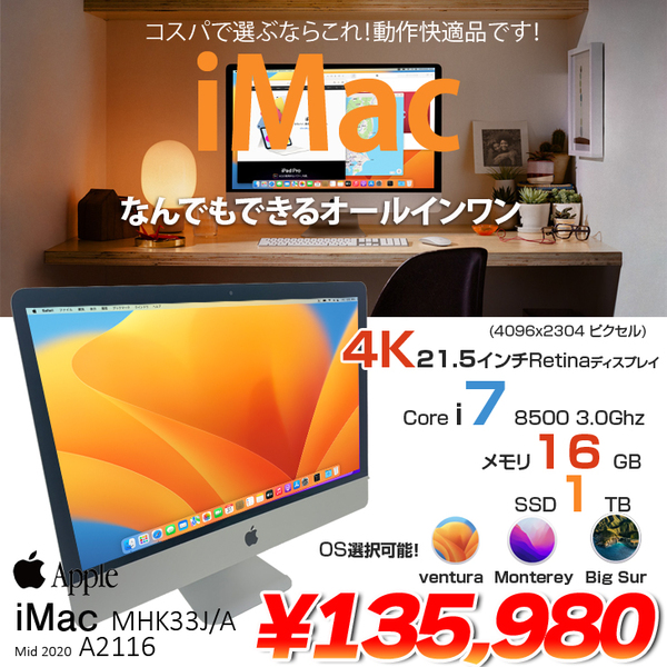 【中古パソコン】Apple iMac 21.5inch MHK33J/A A2116 4K 2020 一体型 選べるOS [Core i7 8700 3.2GHz 16GB SSD1TB 無線 BT カメラ 21.5インチ 純箱 ] :美品