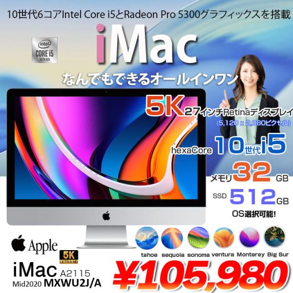 【中古パソコン】Apple iMac 27inch MXWU2J/A A2115 5K 2020 一体型 選べるOS [Core i5 10600 3.3GHz メモリ32GB SSD512GB 無線 BT カメラ 27インチ 純箱]:良品