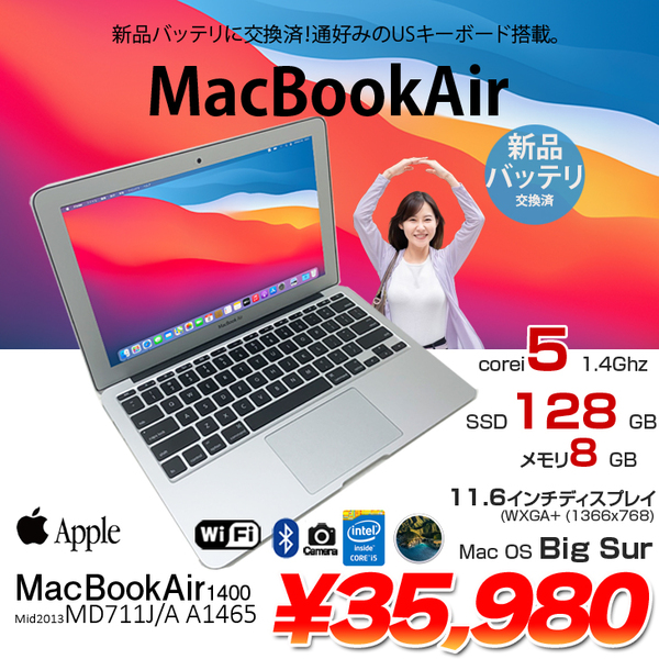 【新品バッテリに交換】Apple MacBook Air 11.6inch MD711J/A A1465 Mid 2013 USキー [core i5 4250U 8GB 128GB 無線 BT カメラ 11.6 BigSur ] :アウトレット