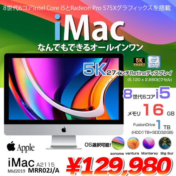 【中古パソコン】Apple iMac 27inch MRR02J/A A2115 5K 2019 一体型 選べるOS [Core i5 8600 3.1GHz 16G Fusion 1TB 無線 BT カメラ 27インチ ]:良品