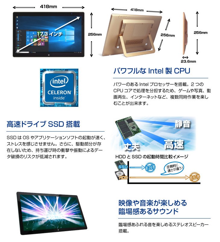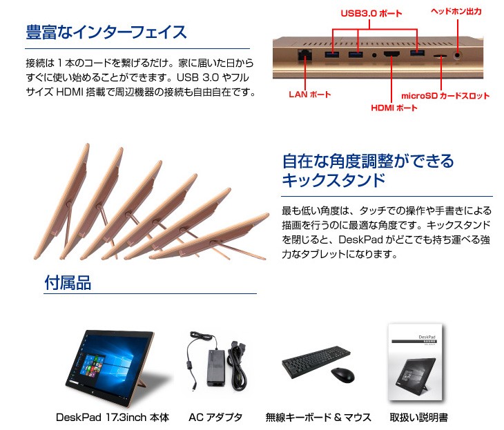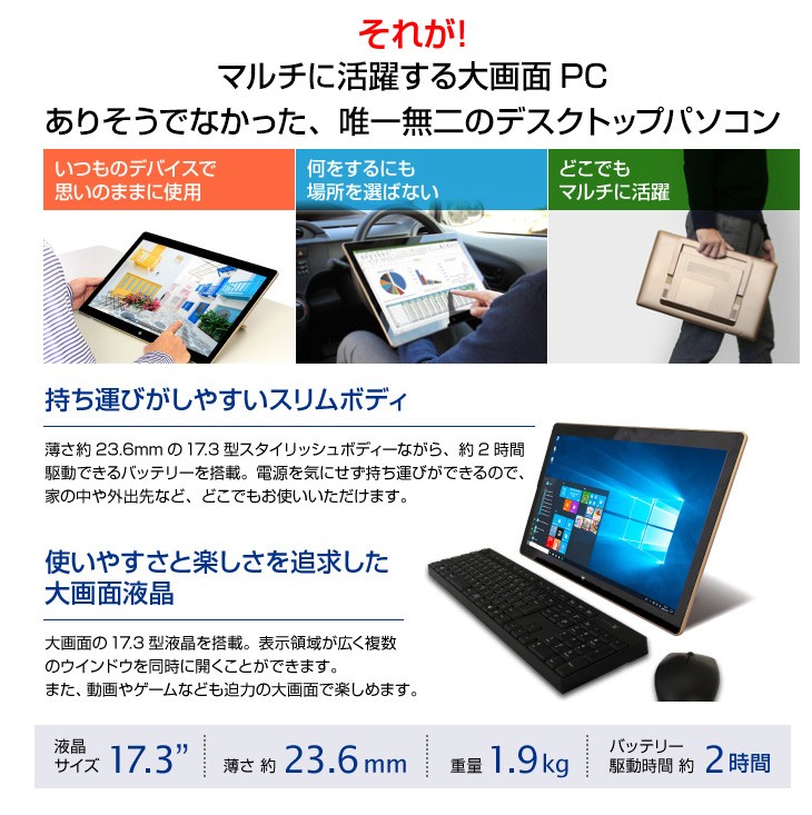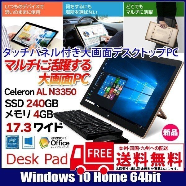 DeskPad17.3インチ 新品 タッチパネル付デスクトップパソコン Windwos10 カメラ 無線[Celeron Apollo Lake N3350 1.1 GHz 4GB 240GB BT キー.マウス]:美品