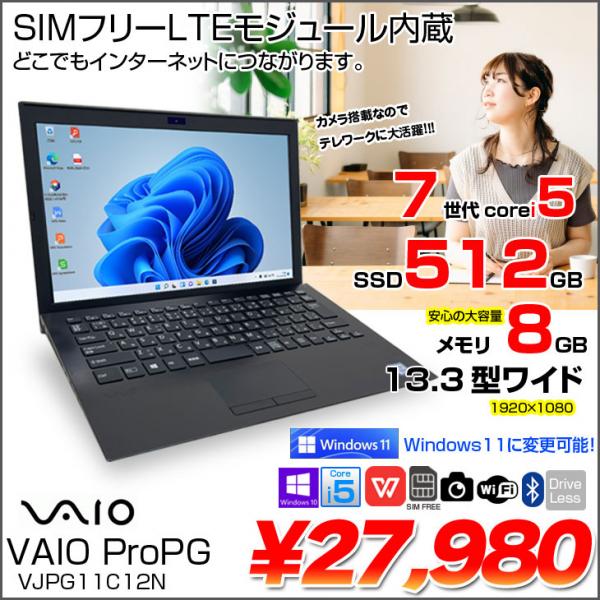 【中古パソコン】VAIO ProPG VJPG11C12N SIMフリー 中古 ノート Office Win10or11 フルHD 第7世代 [Corei5 7200U メモリ8GB SSD512GB 無線 カメラ BT 13.3型]:アウトレット