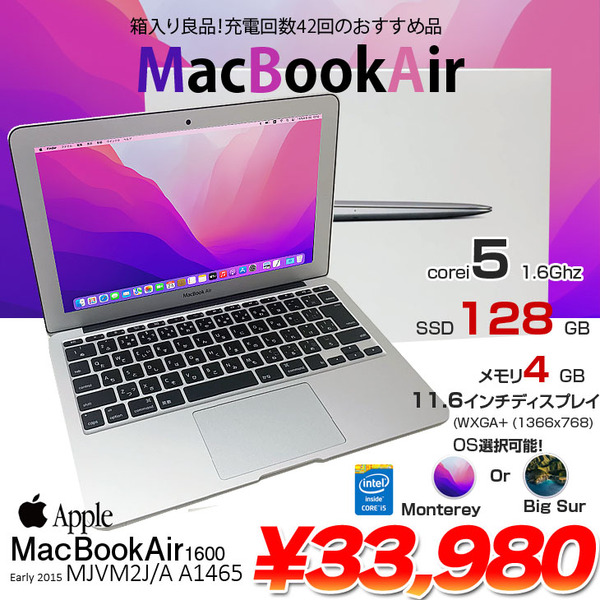 【中古パソコン】Apple MacBook Air 11.6inch MJVM2J/A A1465 Early 2015 選べるOS Monterey or Bigsur [core i5 5250U 4G SSD128GB 無線 BT カメラ 11.6インチ 純箱 ] :良品