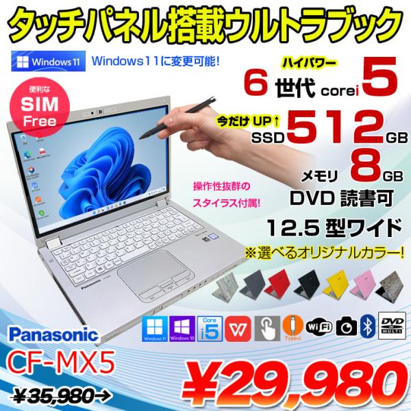 【中古パソコン】Panasonic CF-MX5 中古 レッツノート 選べるカラー Office Win10 or Win11 2in1 ペン付[Core i5 6300U メモリ8GB SSD512GB マルチ 無線 WWAN カメラ 12.5型] :良品