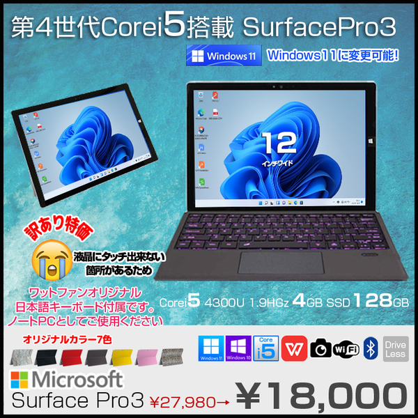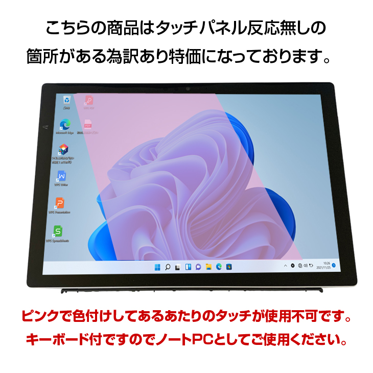 【中古パソコン】Microsoft Surface Pro3 中古 タブレット office Win10Pro [core i5 4300U 4GB SSD128GB 無線 カメラ KB黒 日本語キー] :訳あり品(タッチ×)
