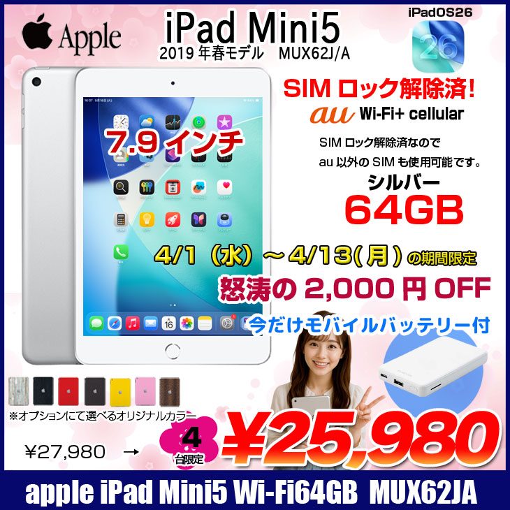 【4/1-13まで期間限定価格+モバイルバッテリをプレゼント】Apple iPad mini5 MUX62J/A A2124 第5世代 au Wi-Fi-cel 64GB [ A12 SSD64GB 7.9 OS 26 シルバー ] :良品 中古