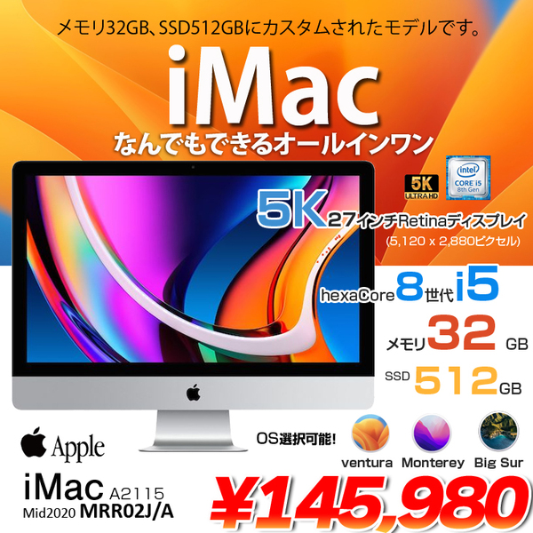 【中古パソコン】Apple iMac 27inch MRR02J/A A2115 5K 2019 一体型 選べるOS [Core i5 8600 3.1GHz 32G SSD512GB 無線 BT カメラ 27インチ ]:美品