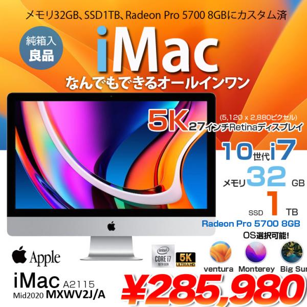 【中古パソコン】Apple iMac 27inch MXWV2J/A A2115 5K 2020 一体型 選べるOS [Core i7 10700K 3.8GHz 32G SSD1TB 無線 BT カメラ 27インチ 純箱 ]:良品