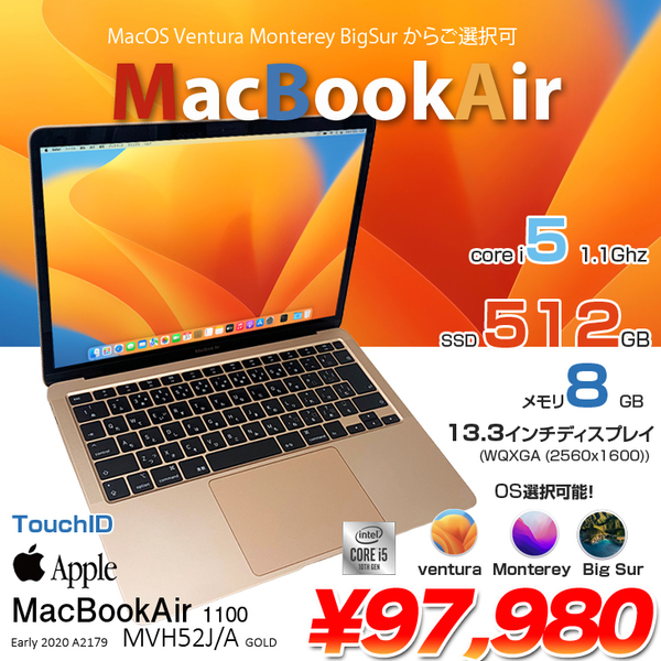 【中古パソコン】Apple MacBook Air 13.3inch MVH52J/A A2179 TouchID 2020 選べるOS [core i5 1030NG7 8G 512GB カメラ 13.3 Gold ] :美品