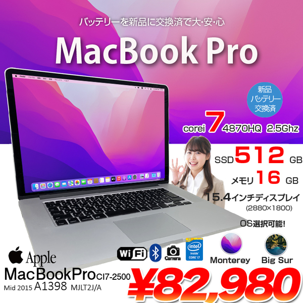【新品バッテリに交換済】Apple MacBook Pro 15.4inch MJLT2J/A A1398 Mid 2015 選べるOS [core i7 4870HQ 16G SSD512GB 無線 BT カメラ 15.4] :アウトレット