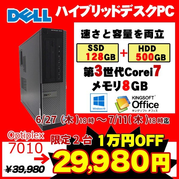 【中古パソコン】DELL ハイブリッドデスクトップパソコン Optiplex 7010 DT 高速SSD+大容量HDD Office Win10 Corei7 3770 3.4GHz メモリ8G 120GB(SSD)&HDD500GB マルチ]:良品