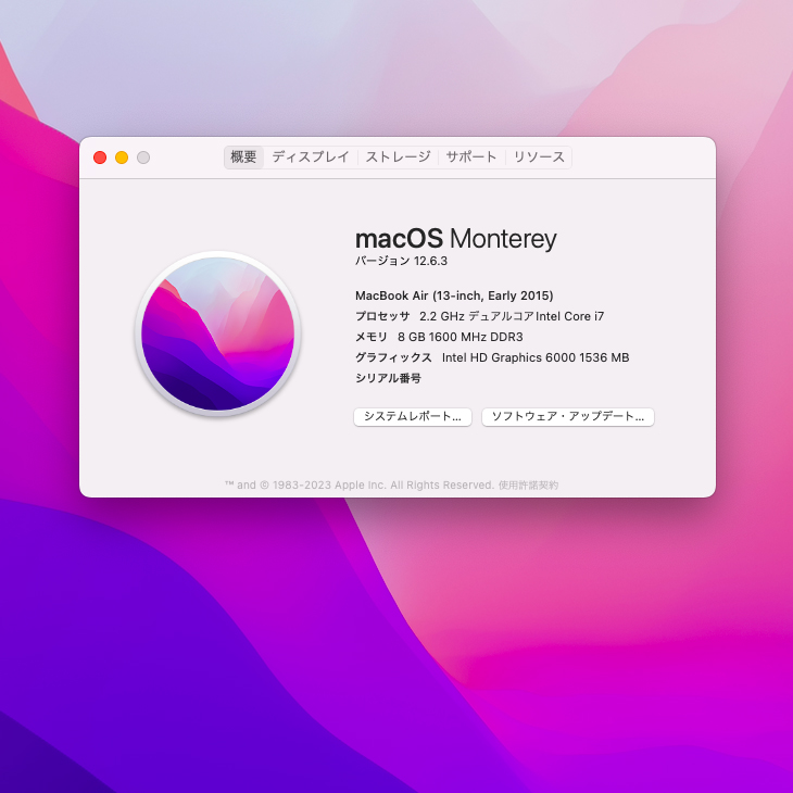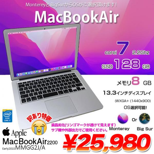 【中古パソコン】Apple MacBook Air 13.3inch MMGG2J/A A1466 Early 2015 選べるOS Monterey or Bigsur [core i7 5650U 8G SSD128GB 無線 BT カメラ 13.3 ] :訳あり(液晶△)