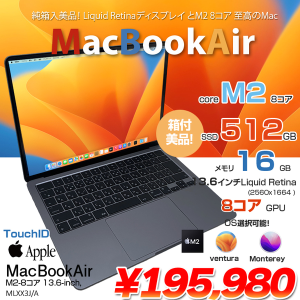 【中古パソコン】Apple MacBook Air 13.6inch MLXX3J/A A2681 2022 TouchID [Apple M2 8コア メモリ16GB SSD512GB 無線 BT カメラ 純箱 Space Gray] :美品