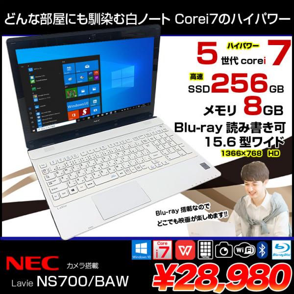 【中古パソコン】NEC LAVIE NS700/BAW 中古 ノート Office Win10 home 第5世代 [Core i7 5500U 8GB SSD256GB BD 無線 テンキー カメラ 15.6型 ホワイト] :良品