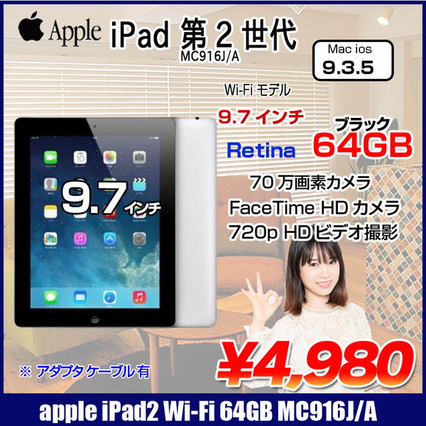 【中古iPad 送料無料】Apple iPad 2 MC916J/A Wi-Fiモデル 64GB [ A5 1GHz 64GB(SSD)9.7インチ OS:9.3.5 ブラック]:良品