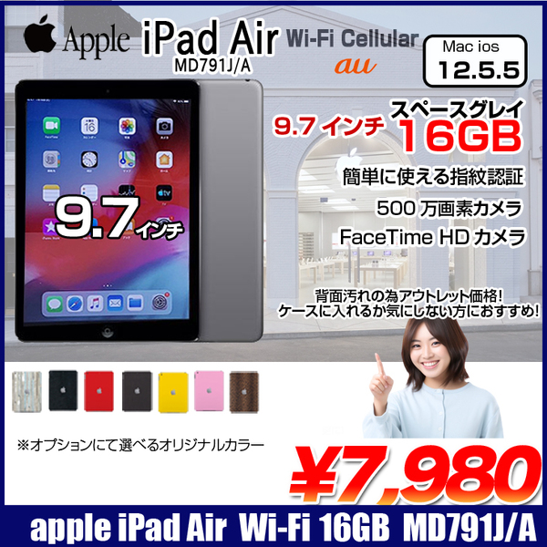 【中古iPad】Apple iPad Air Retina au Wi-Fi Cellular 16GB MD791J/A 選べるカラー [Apple A7 16G 9.7インチ OS 12.5 スペースグレイ ] :アウトレット