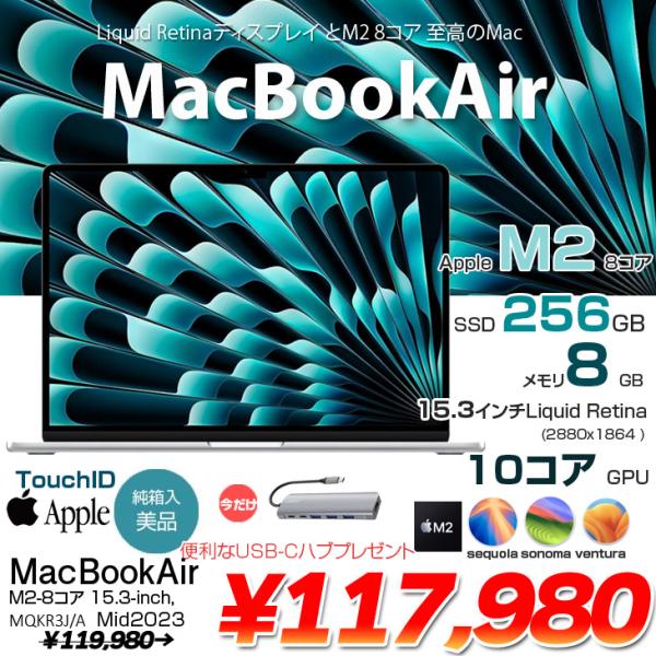 【中古パソコン 今だけUSB-Cハブプレゼント】Apple MacBook Air 15.3inch MQKR3J/A A2941 2023 TouchID 選べるMacOS [Apple M2 8コア メモリ8G SSD256GB 無線 BT カメラ 15.3 Silver 純箱] :美品