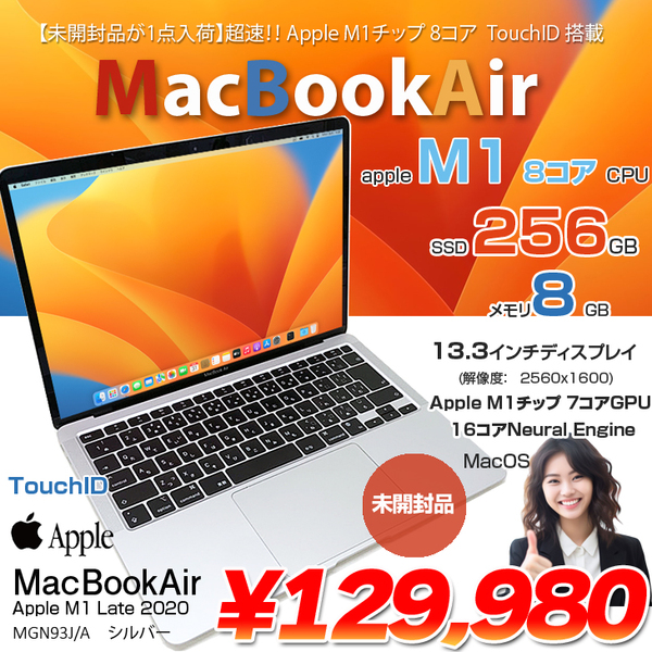 【中古パソコン 未開封】Apple MacBook Air 13.3inch MGN93J/A A2337 2020 MacOS TouchID [Apple M1チップ 8コア 8GB SSD256GB 無線 BT カメラ 13.3 純箱 Silver] :未開封品