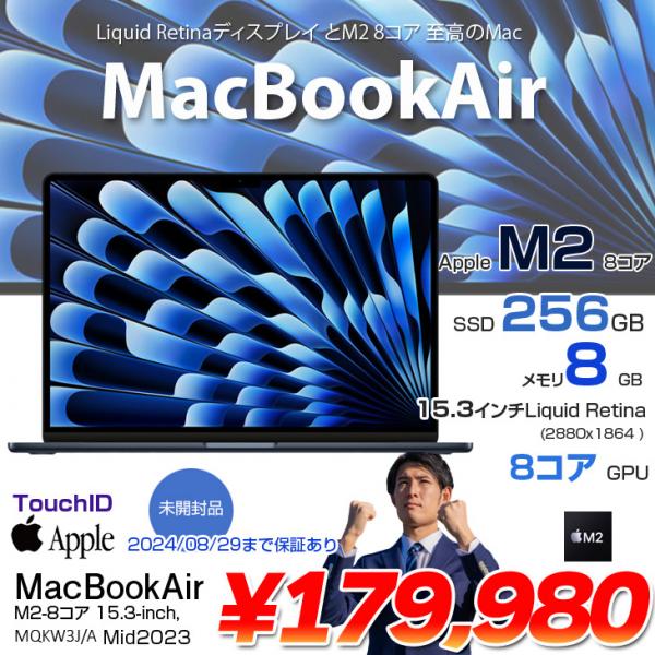 【中古パソコン 未開封品】Apple MacBook Air 15.3inch MQKW3J/A A2941 2023 TouchID MacOS Sonoma Ventura [Apple M2 8コア メモリ8G SSD256GB 無線 BT カメラ 15.3 Midnight ]
