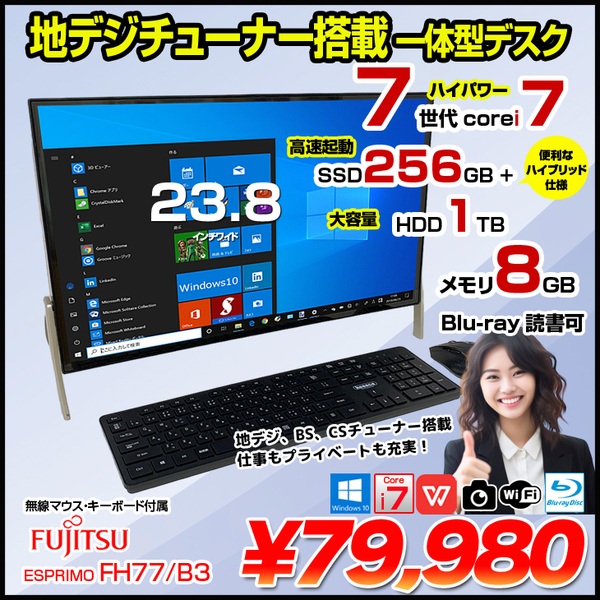 【中古パソコン】富士通 ESPRIMO FH77/B3 中古 一体型 地デジ Office Win10home キーマウス[Core i7 7700HQ 8GB SSD256GB HDD1TB Blu-ray 無線 BT カメラ 23.8型 黒]:良品