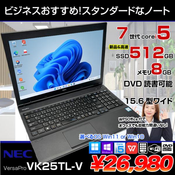 【中古パソコン】NEC VersaPro VK25TL-V 中古ノート 選べる Win11 or Win10 Office 第7世代 [Corei5 7200U 2.5GHz メモリ8GB SSD512GB DVDマルチ 無線 15.6型 ] :良品