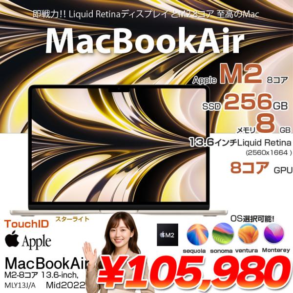 【中古パソコン】Apple MacBook Air 13.6inch MLY13J/A A2681 2022 選べるOS TouchID [Apple M2 8コア メモリ8GB SSD256GB 無線 BT カメラ 13.6 Starlight 純箱] :美品
