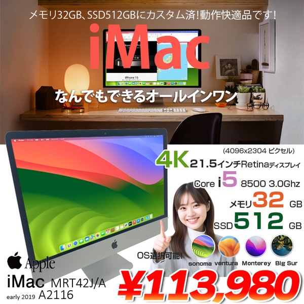 【中古パソコン】Apple iMac 21.5inch MRT42J/A A2116 4K 2019 一体型 選べるOS [Core i5 8500 メモリ32GB SSD512GB 無線 BT カメラ 21.5インチ] :良品