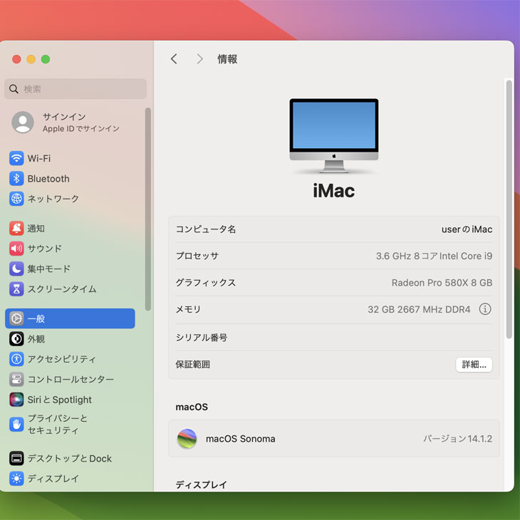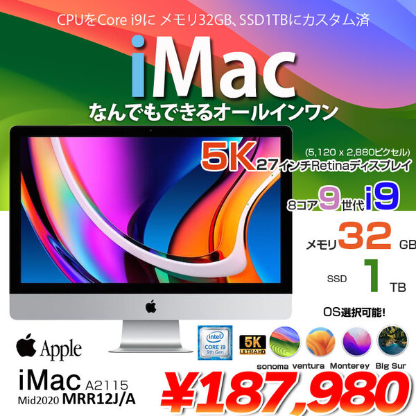 【中古パソコン】Apple iMac 27inch MRR12J/A A2115 5K 2019 一体型 選べるOS [Core i9 9900K 3.6GHz 32GB SSD1TB 無線 BT カメラ 27インチ 純箱]:美品