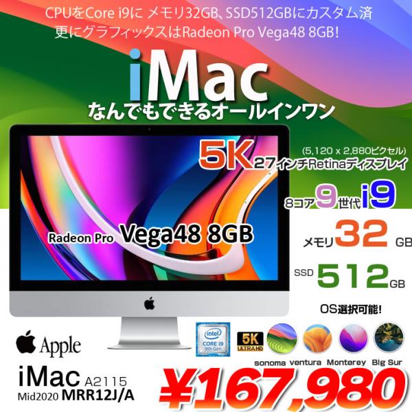 【中古パソコン】Apple iMac 27inch MRR12J/A A2115 5K 2019 一体型 選べるOS Radeon Pro Vega48 [Core i9 9900K 3.6GHz 32GB SSD512GB 無線 BT カメラ 27インチ 純箱]:美品
