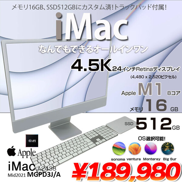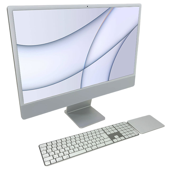 【中古パソコン】Apple iMac 24inch MGPD3J/A A2438 4.5K 2021 一体型 選べるOS Touch ID [Apple M1 8コア 16GB SSD512GB 無線 BT カメラ 24インチ Silver 純箱 Trackpad ]:美品