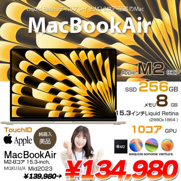 【中古パソコン】Apple MacBook Air 15.3inch MQKU3J/A A2941 2023 TouchID [Apple M2 8コア 8G SSD256GB 無線 BT カメラ 15.3 Starlight 純箱] :美品
