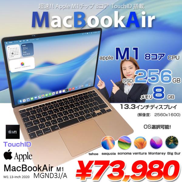 【中古パソコン】Apple MacBook Air 13.3inch MGND3J/A A2337 2020 選べるOS TouchID [Apple M1チップ 8コア 8G SSD256G 無線 BT カメラ 13.3 Gold] :良品