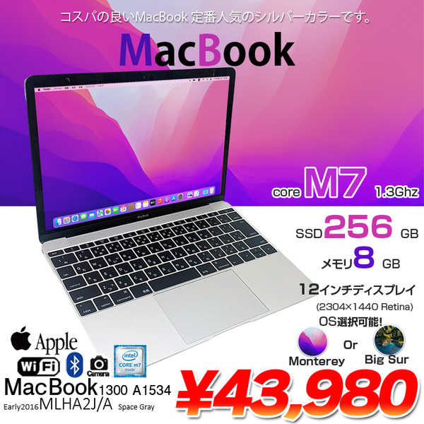 【中古パソコン】Apple MacBook 12inch MLHA2J/A A1534 Retina Early 2016 選べるOS [Core M7 6Y75 1.3GHz メモリ8GB 256GB 無線 BT カメラ 12インチ Silver ] :アウトレット