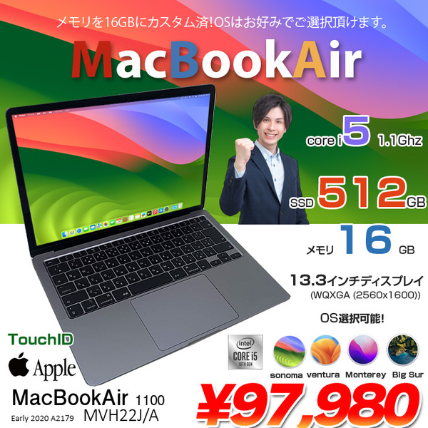 【中古パソコン】Apple MacBook Air 13.3inch MVH22J/A A2179 TouchID 2020 選べるOS [core i5 1030NG7 1.1GHz 16GB SSD512GB カメラ 13.3 Space Gray ] :アウトレット