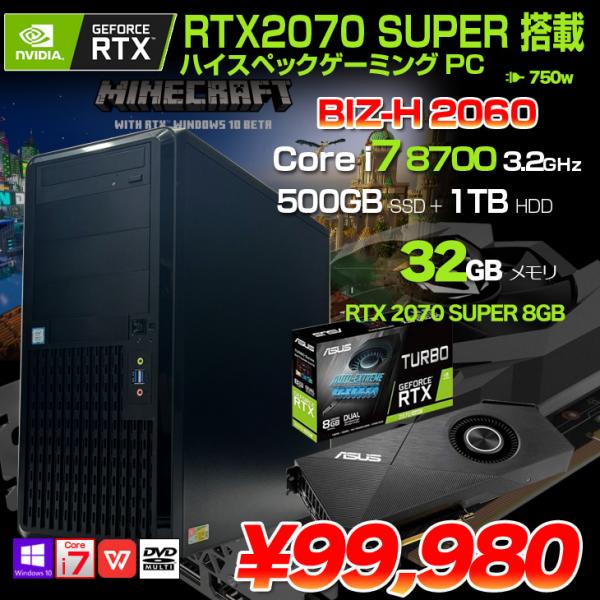 BIZ-H eスポーツ RTX2070搭載ゲーミング 中古 デスク Office Win10 第8世代 [Core i7 8700 メモリ32GB SSD500GB+HDD1TB マルチ 電源750W]