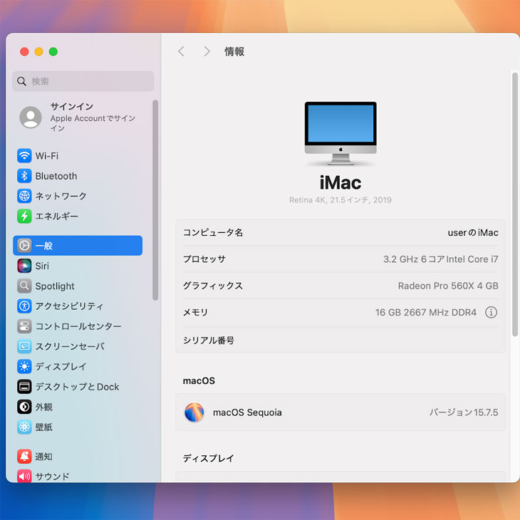 本体型番 : Apple iMac MRT42J/A A2116 Retina 4K,21.5-inch,2019
