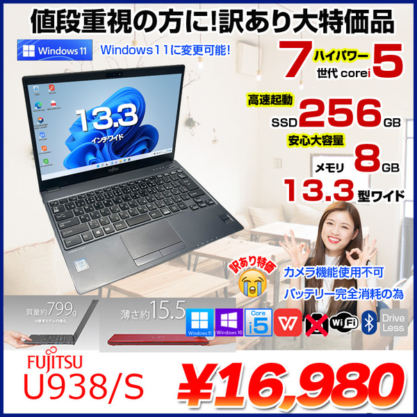 【中古パソコン】富士通 LIFEBOOK U938/S 中古 ノートOffice 選べるOS Win10 or Win11 第7世代[Core i5 7300U 8GB SSD256GB 無線 13.3型] :訳あり(カメラ× バッテリ×)