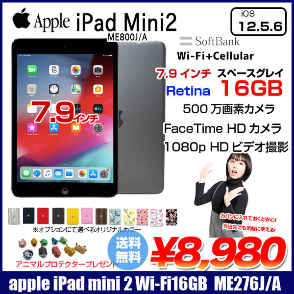 【中古iPad】Apple iPad mini2 ME800J/A Softbank Wi-Fi+Cellular 16GB 選べるカラー [ A7 16GB(SSD)7.9インチ OS 12.5.7 スペースグレイ] :良品 中古 アイパッドミニ 本体