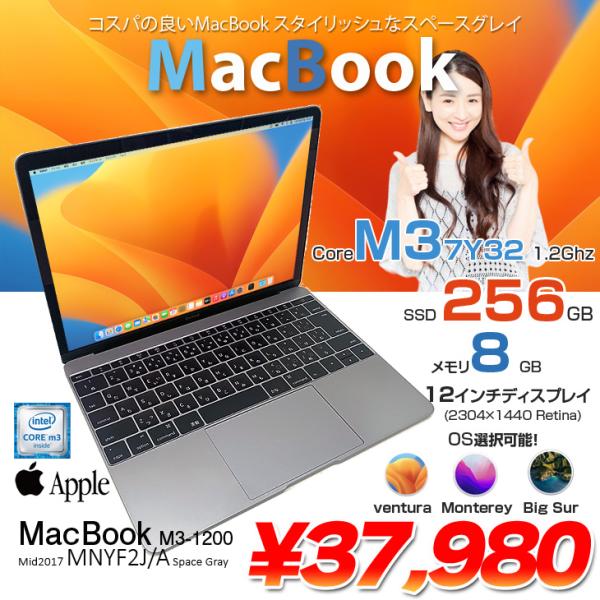 【中古パソコン】Apple MacBook 12inch MNYF2J/A A1534 Retina Mid 2017 選べるOS [Core M3 7Y32 1.2GHz 8G 256GB 無線 BT カメラ 12インチ Space Gray ] :アウトレット