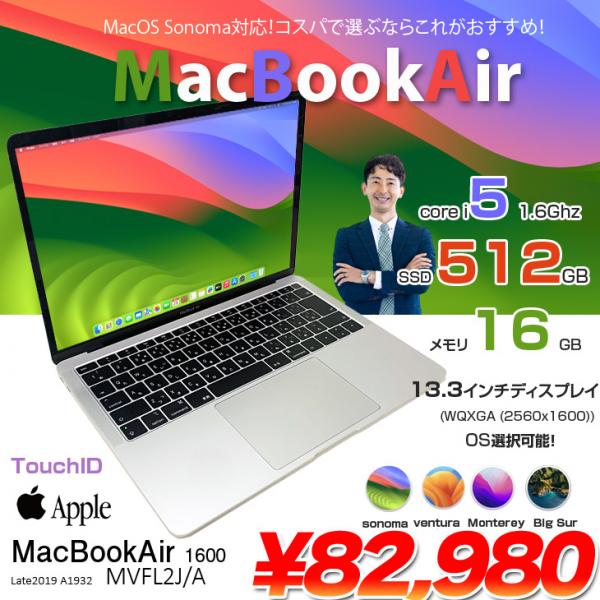 【中古パソコン】Apple MacBook Air 13.3inch MVFL2J/A A1932 Retina 2019 選べるOS [core i5 8210Y 16G SSD512GB 無線 BT カメラ 13.3 ] :美品