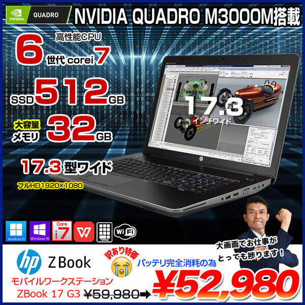 【中古パソコン】 HP ZBOOK 17 G3 MobileWorkstasion 中古 Office Windows10 フルHD NVIDIA QUADRO 第6世代 [core i7 6700HQ 32GB 512GB 17.3型 ] :訳あり品(バッテリ×)