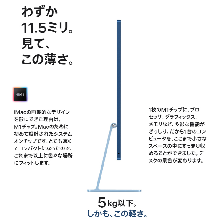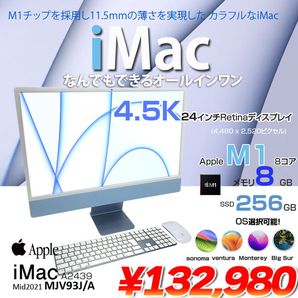 【中古パソコン】 Apple iMac 24inch MJV93J/A A2439 4.5K 2021 一体型 選べるOS [Apple M1 8コア 8GB SSD256GB 無線 BT カメラ 24インチ 純箱 Blue ]:美品