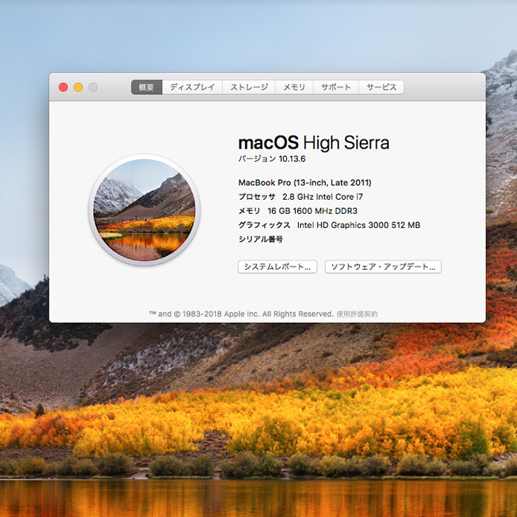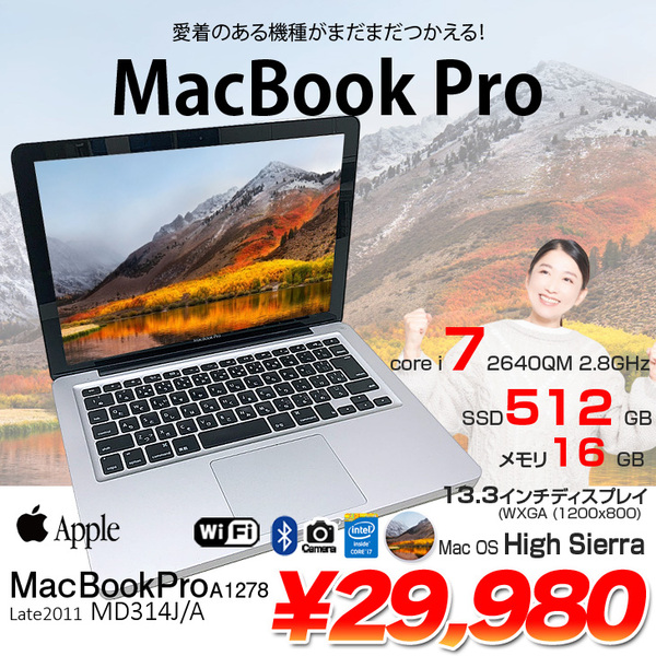 【中古パソコン】Apple Macbook Pro MD314J/A A1278 Late2011 [core i7 2640QM 2.8GHz 16GB SSD 512GB 無線 BT 13インチ マルチ macOS High Sierra 10.13.6] :アウトレット