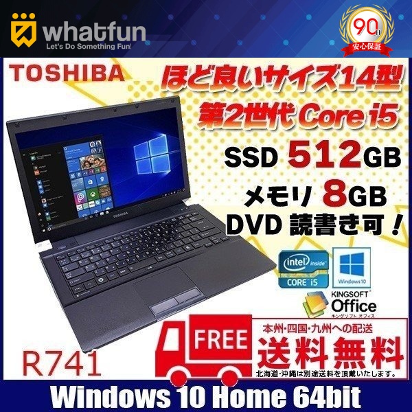【中古パソコン】東芝 R741 中古 ノートパソコン Office Win10 Home 64bit モバイル 第二世代 [core i5 2520M 2.5GHz 8G SSD512GB マルチ 14型 HDMI USB3.0] :良品